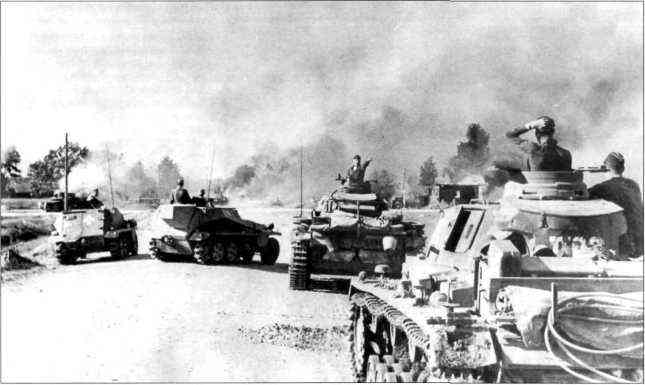 Германские танки в украинский степи, начало августа 1941 г. Слева — колонна танков Pz. Kpfw. II. Справа — бронетранспортёр Sd. Kfz.251, на корме которого нанесён красный крест. Летом 1941 г. в танковых дивизиях имелось совсем немного бронетранспортёров Sd. Kfz.251. Их использовали, главный образом, для срочной переброски пехоты из одного места в другое и для эвакуации раненных с поля боя.