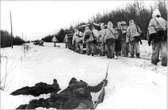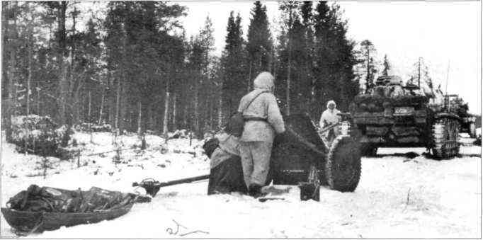 Солдаты в белых маскхалатах готовятся к бою, в котором их поддержит танк Pz. Kpfw. II. Снимок начала марта 1942 г. Танк выкрашен в белый цвет. На корме танка устроился пулемётчик с пулемётом MG-34.