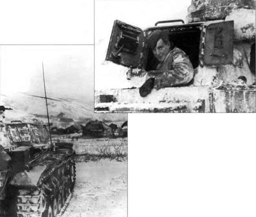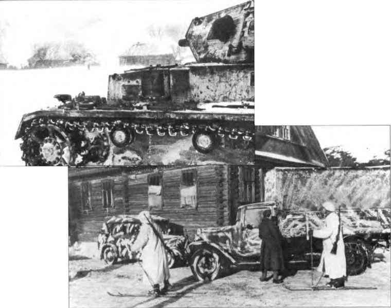 Верхний снимок — Танк Pz. Kpfw. III Ausf. F обстреливает русскую деревню, февраль 1942 г Танки Pz. Kpfw. III Ausf. F, имевшие более мощные пушки по сравнению с танками более ранних вариантов, всё равно могли пробить броню KB и Т-34 только стреляя почти в упор. Ситуация несколько улучшилась только с проявлением модификации Ausf. F2. Белая маскировочная окраска с брони танка сильно облезла.