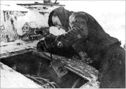 Боец ремонтирует танк Pz. Kpfw. IV, начало зимы 1942 г. Суровая зима крайне отрицательно сказывалась на работоспособности людей. Зимой 1941 г. под Москвой панцерваффе потерпели первое крупное поражение во Второй мировой войне. Германская армия лишилась здесь большого количества бронетехники.