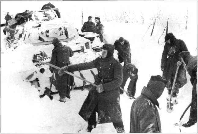 Солдаты расчищают сугроб вокруг танка Pz. Kpfw. III Ausf. J из 5-й панцердивизии, конец мирта 1942 г. Это известная машина 5-й дивизии, окрашенная в двухцветный камуфляж: белые разводы поверх исходной серой окраски.