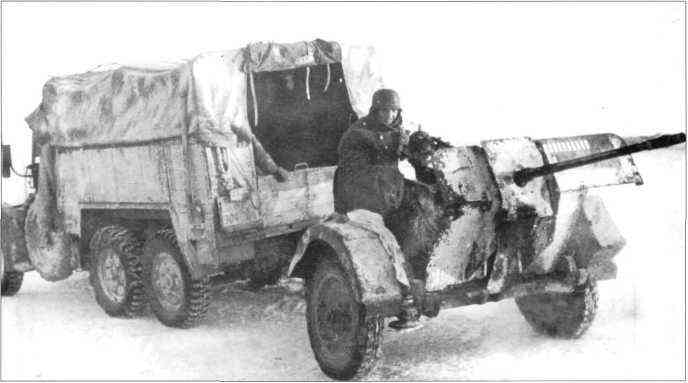 Грузовик Круп «Протце» с 20-мм зенитной пушкой на прицепе. Пушки и грузовик выкрашены в белый цвет. Зенитные части, приданным панцердивизиям, оставались в ведении люфтваффе. На щите пушки нанесены отметки об уничтоженных целях.