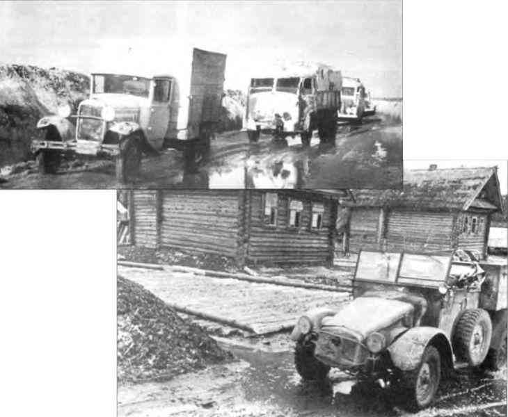 Верхний снимок — Колонна грузовиков на российской автостраде, март 1942 г. На переднем плане — трофейный советский грузовик, за ним — трофейный французский грузовик. Все машины выкрашены для маскировки в белый цвет.