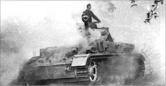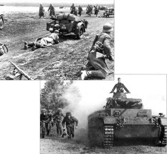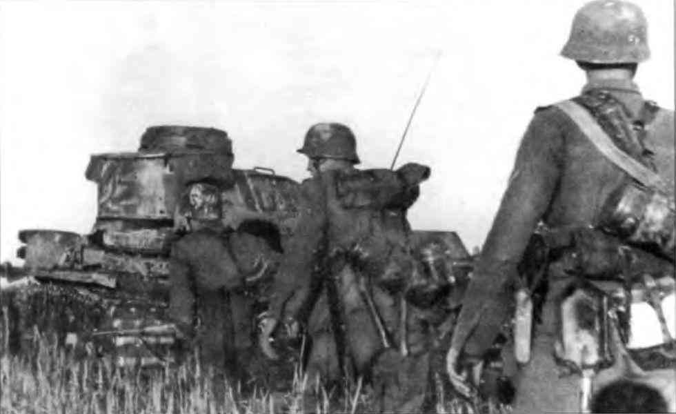 Начало июля 1942 г. — группа германских воинов следует за танком Pz. Kpfw. III. Танк и каски бойцов камуфлированы, скорее всего грязью.
