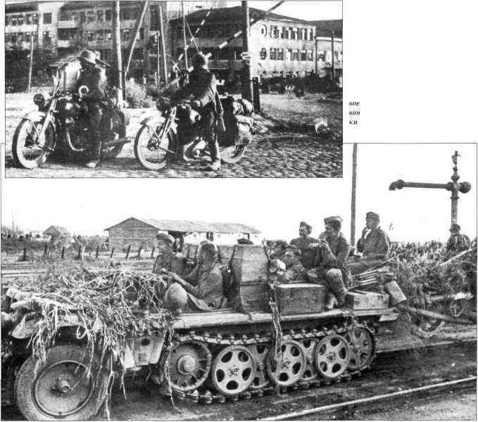 Нижний снимок — Ростов, июль 1942 г.: тягач Sd. Kfz, 10 замаскирован растительностью. На буксире тягач тянет противотанковое орудие РаК-40, также замаскированное ветками. Летом 1942 г. пушки РаК-40 всё ещё оставались на фронте редкостью.
