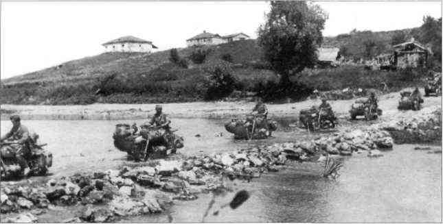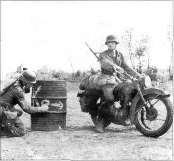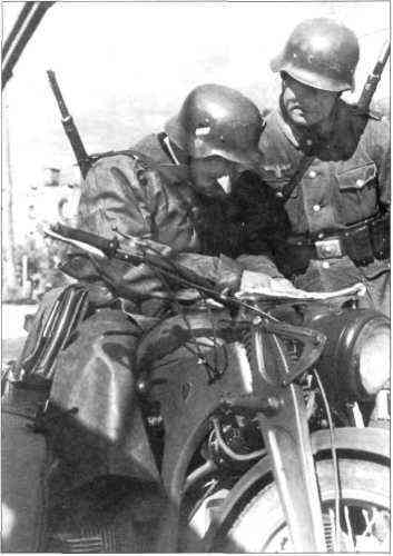 Два мотоциклиста изучают топографическую карту, район Воронежа, июнь или июль 1942 г. В начальный период войны мотоциклисты часто принимали непосредственное участие в военных действиях, как на колесах, так и спешенными. Мотоциклы, однако, оказались очень уязвимы от огня всех типов оружия, поэтому в конце 1941 г. мотоциклистов к участию в боях старались уже не привлекать. Основными задачами мотоциклистов стали ведение разведки и посыльная служба.