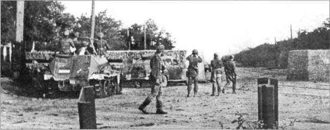 Полугусеничный бронетранспортёр Sd. Kfz. 25 из 23-й танковой дивизии остановился у советских укреплений, Ростов, июль 1942 г. На броне машины нанесены эмблема 23-й панцердивизии и тактический знак мотопехоты. Пехотинцы — солдаты дивизии СС «Викинг». Вермахт в боях часто кооперировался с войсками СС.