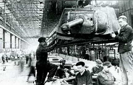 Цех еще не достроен, а производство Т-34 уже ведется. ЧКЗ, август 1942 г.