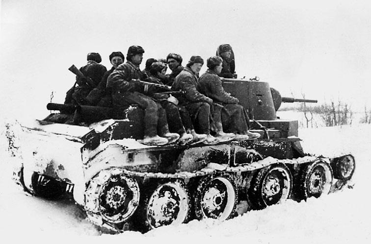 Танк БТ-7 с пехотным десантом выдвигается на рубеж для атаки. Западный фронт, 150-я танковая бригада, ноябрь 1941 года