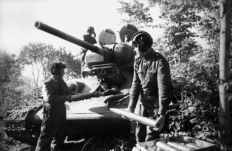 Экипаж загружает боеприпасы в танк Т-34. Воронежский фронт, 1943 год