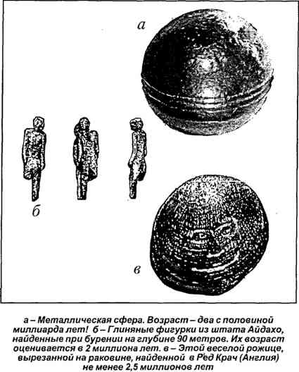Помимо человеческих скелетов и следов, существуют многочисленные археологические артефакты. Так странного вида металлические трубы найдены в Сан-Жан-де-Ливе, (Франция) замурованные в меловых отложениях. Их возраст оценивается в 65 миллионов лет. Неподалёку от австрийского городка Феклабрук осенью 1885 года был найден вмурованный в кусок бурого угля металлический предмет, напоминающий пухлую подушечку, у которой имелась ровная бороздка, опоясывающая куб со всех сторон. Чьи-то разумные руки касались его, в то далёкое время, когда окружающий его уголь зеленел в виде буйной растительности. Этот предмет длительное время экспонировался в Зальцбургском музее, отчего получил название «зальцбургский параллелепипед». Колоколообразный сосуд из неизвестного металла был извлечён на свет божий в 1851 году во время проведения взрывных работ в штате Массачусетс близ Дорчестера. Твёрдая порода, которая облепляла сосуд и сверху и изнутри имела возраст 590 миллионов лет!