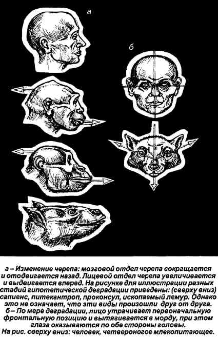 У четвероногих животных мозговой череп сокращается и отодвигается назад, а лицевой отдел черепа, напротив, вытягивается вперёд, увеличиваются челюсти и зубы. У хищных животных это обеспечивает быстрое схватывание добычи. Понятно, почему это происходит — руки, ставшие лапами, во время охоты заняты бегом и не могут оказать их хозяину должную помощь. Лишь только когда зверь совершает бросок, его когти имеют шанс вонзится в тело жертвы. Во время охоты хищники обычно впиваются в шею жертвы зубами, а передними лапами прижимают её тело к земле. (Лапа четвероногих отличается от руки человека не только тем, что четвероногие научились ходить, опираясь на пальцы, но и тем, что «рука» зверей превратились из совершенного манипулятора в дополнительную точку опоры. Большой палец уже не противостоит остальным и не участвует в удержании лапой предмета).