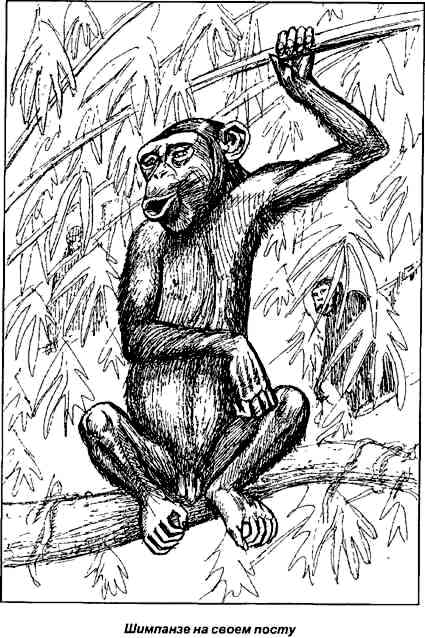 Шимпанзе не забыли вероломство людей и всякий раз, когда человек вторгается на их территорию, поднимают невообразимый галдёж, кидаются в него палками и, в конце концов, заставляют ретироваться. Впрочем, они точно так же себя ведут при приближении конкурирующей группы обезьян. Они ухают, лают, хрипят, визжат, топочут без всякой меры, неистово трясут ветви и остервенело бьют лапами по пустым стволам, поднимая такой шум, который слышан порою за 3 километра. В придачу обезьяны воруют в местных деревнях барабаны и, что есть силы, лупят в них. Дикие потомки людей при этом приводят себя в высшую стадию возбуждения и получают от этого безумия не с чем не сравнимое наслаждение.