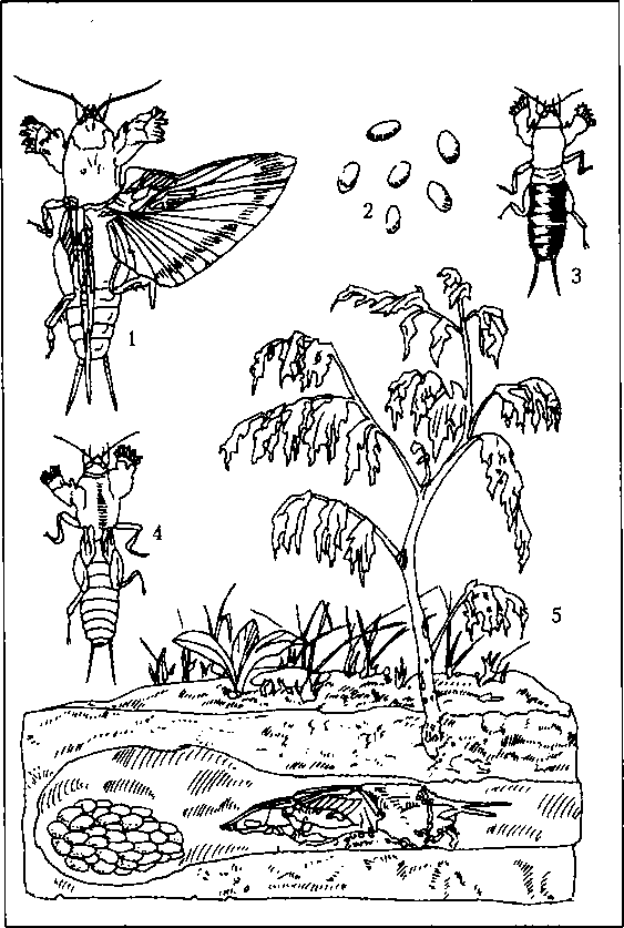 Обыкновенная медведка:1 — взрослая; 2 — яйца; 3 и 4 — личинки; 5 — медведка у кладки яиц в гнезде, повреждающая корень томата