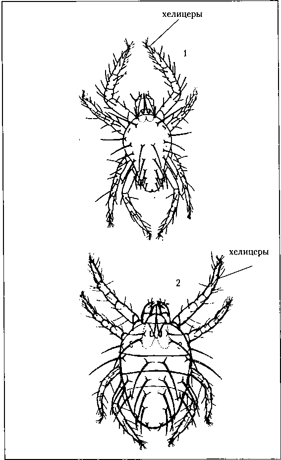 Паутинные клещи:1 — самка (вид сверху); 2 — самец (вид сверху)