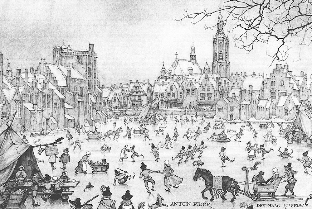 Рисунок голландского живописца Антона Пика, жители Гааги катаются на коньках по замерзшей реке