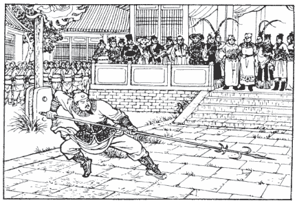 Затем воин брал в руки тяжелую алебарду и показывал с ней основные приемы: вращение влево-вправо с уколом, затем вращение перед собой и сзади, что считалось основным защитным действием. Экзаменационная алебарда была страшно тяжела. Так же как и лук, по своему весу она подразделялась на три категории — 40 кг, 50 кг и 60 кг. На столичных экзаменах необходимо было демонстрировать технику с самой тяжелой алебардой.