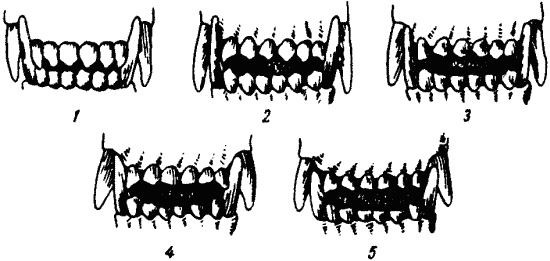 1 — нормальный или ножницеобразный прикус, 2 — клещеобразный прикус, 3 — недокус, 4 — перекус.