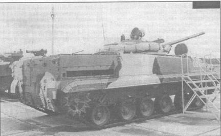 В 1989 г. началось поступление на вооружение нового поколения боевых машин пехоты, известных как БМП-3. Эта модель БМП отличается от своих предшественниц компоновкой моторно-трансмиссионного отделения, которое размещается не в носовой части корпуса, а в корме. БМП-3 имеет отличное сочетание основных боевых свойств. Кроме мощного комплекса вооружения, включающего в себя 100-мм орудие (которое одновременно является и пусковой установкой для противотанковых управляемых реактивных снарядов), автоматическую 30-мм пушку, гранатомет и три пулемета калибра 7,62 мм, машина обладает приемлемой для этого класса машин броневой защитой и высокой подвижностью на местности. Пушки стабилизированы в двух плоскостях и оснащены автоматизированной системой управления огнем, обеспечивающей быструю подготовку данных для стрельбы и высокую вероятность поражения целей как при движении по суше, так и при движении по воде. Большой угол возвышения оружия до 60° позволяет вести огонь по вертолетам, самолетам и другим высокорасположенным целям в горах, городах и т.д.