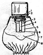 Граната №82 I – нарезы взрывателя. 2-предохранительный колпак. 3.6-шерстянная прокладка 4-детонатор. 5-ударныйсостав. 7-трикотажный мешочек. 8-взрывчатое вещество