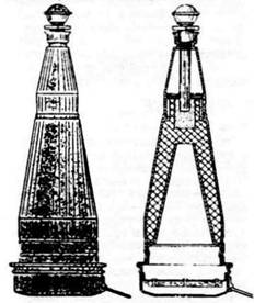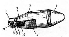1 – донный колпачок; 2 – капсюль- детонатор; 3 – корпус; 4 – оживало; 5- взрывчатое вещество; 6 – оседающий цилиндр (инерционный грузик); 7 – проволочная чека; 8 – ударник с жалом; 9 – -стакан; 10 – шайба