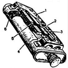 Британская граната-мина №75 1-нажимная планка. 2-складка. 3- коробка взрывателя, 4-основной заряд, 5-химический взрыватель, 6- промежуточный детонатор