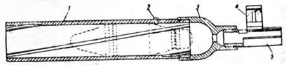 Разрез мортирки гранатомета Дьяконова, приспособленной для стрельбы гранатой ВКГ-40. 1 – ствол, 2 – ограничительный винт, 3 – чашечка, 4 – мушка винтовки, 5 – шейка