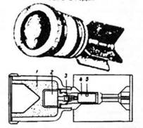 Винтовочная кумулятивная граната №68, общий вид и разрез: 1 – разрывной заряд с кумулятивной воронкой, 2 – капсюль-детонатор, 3 – капсюль-воспламенитель. 4 – ударник, 5 – предохранитель