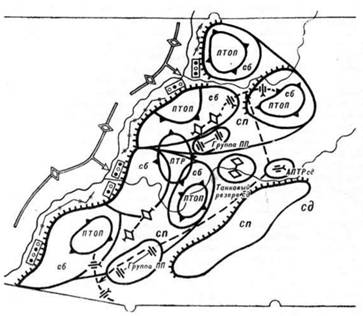 В оборонительном сражении под Курском летом 1943г стрелковые соединения создали глубоко эшелонированную ПТО. возросла плотность ПТС В практике войск все более утверждается организация ПТО, основанная на своеобразной "сети" – системе ПТ опорных пунктов, узлов и районов. Боевой порядок стрелковой дивизии в обороне включал от 4 до 8-13 ПТОПов, имевших между собой огневую связь В 15-м стрелковом корпусе, например, было создано 24 ПТОПа (15 в главной полосе обороны и 9 во второй), объединенных в 9 ПТ районов. Однако опыт показал, что центр тяжести ПТО правильнее переносить в батальоны, объединяя 2- 3 ротных ПТОПа в батальонные ПТ узлы (4-6 в полосе дивизии), прикрывая их ПТ заграждениями и препятствиями. ПТ узлы взаимодействовали с ПТОПами и ПТ районами в глубине обороны В состав ПТОП обычно включались 4-6 орудий (на главных направлениях – до 12), 6-9 или 9-12 ПТР. 2-4 миномета, 2-3 станковых и 3-4 ручных пулемета, взвод автоматчиков и отделение (иногда взвод) саперов с ПТ минами, иногда – танки и САУ. Начальниками (комендантами) ПТОП назначались командиры рот и батальонов Выросло насыщение Действующей армии ПТ артиллерией – если в ноябре 1942г на 1000 бойцов приходилось 1.7 ПТ пушки. то в июле 1943г – 2.4 Кроме ПТ пушек артиллерия ПТОП могла включать 85-мм зенитные пушки и даже 152-мм гаубицы и гаубицы-пушки для борьбы с новыми тяжелыми германскими танками Здесь применялась и стрельба по танкам