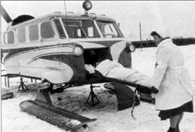Отработка загрузки носилок через передний люк и дверь при увязке санитарного варианта Ка-30. На фото внизу хорошо видна подвеска двух носилок в грузопассажирском отсеке.