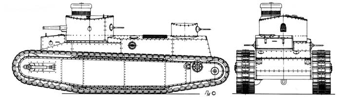 По внешнему виду танк ГУВП* напоминал бронепоездную площадку на гусеничном ходу, в носовой части корпуса которой располагалась башня с 76,2-мм короткоствольной пушки обр. 1913 г. В шаровых опорах, расположенных в бортовых и кормовом листах корпуса, устанавливались три сдвоенных пулемета системы Федорова калибра 6,5 мм. Для наблюдения за полем боя служила командирская башенка со стробоскопом.