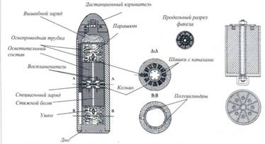 Такой снаряд имел дно, которое удерживалось (закреплялось) относительно корпуса несколькими шпильками. Внутри корпуса снаряда укладка (факел и парашютная система в полуцилиндрах) размещалась таким образом, что воспламенитель осветительного состава был обращен к дистанционному взрывателю. В головной части корпуса снаряда имелось несколько отверстий — каналов, которые, когда снаряд собран, перекрывались изнутри корпусом факела.