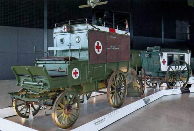 Слева: войсковой санитарный транспорт начала XX века: дивизионная санитарная повозка модели 1906 г. за ней - ручная санитарная тележка и батальонная санитарная двуколка.