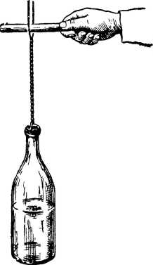 Когда бутылка начнет вращаться на раскручивающихся веревках (а для быстроты вращения можно давить палочкой сверху на место скрутки), мы увидим следующую картину: кусочки пробки собрались в центре поверхности воды. Вода, как более тяжелая, чем пробка, отжимается центробежной силой к стенкам бутылки, а пробка остается посередине.