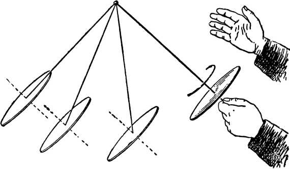 А теперь проделайте следующее: прежде чем качнуть маятник, раскрутите кружок вокруг бечевки, используя ее как ось вращения. Теперь при качании маятника с вращающимся вокруг своей оси кружком вы увидите совсем другую картину. Кружок будет перемещаться в пространстве, сохраняя постоянный угол наклона к горизонту. Его незримая ось вращения все время сохраняет постоянство своего направления, хотя сам шпагат и изменяет свое положение по отношению к кружку.