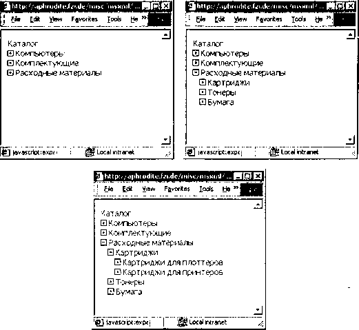 Рис. 9.10. Динамический каталог на HTML с использованием JavaScript, MSXML на основе XML и XSLT