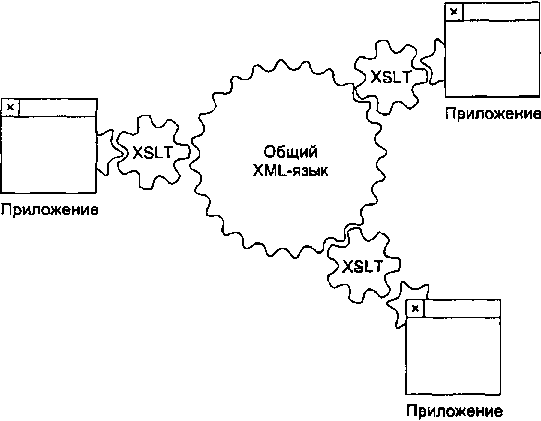 Здесь XSLT исполняет роль связующего звена между XML-интерфейсами приложений и общим XML-языком. Эта схема легка в реализации (поскольку не требует знания внутреннего устройства приложений), масштабируема (задача добавления новых приложений и систем заключается в создании дополнительной пары преобразований) и концептуально целостна (так как основана только на XML-технологиях).