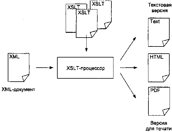 В таком виде XSLT создает сильную конкуренцию серверным скриптовым языкам типа ASP, JSP, PHP, Python и так далее. Web-системы, построенные на XML и XSLT, гораздо гибче и легче в реализации, а их масштабируемость нельзя даже сравнивать. В традиционных системах добавление еще одного представления данных (например, текстовой версии документа или версии "для печати") — это еще одна программа на сервере, в то время как в системах, использующих XSLT, — это всего лишь еще одно преобразование (рис. 2.8).