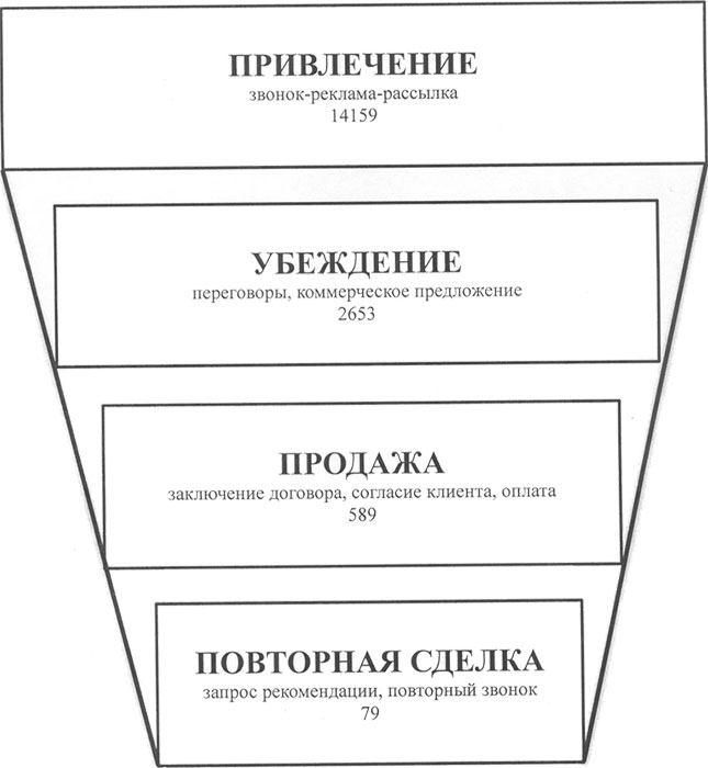 Схематически воронку продаж можно изобразить как отсеивание n-клиентов при прохождении этапов продаж (цифры условные).