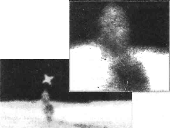 Рис. 4-6. Крупный план Фрагмента, аномального вертикального лунного объекта, имеющего внутренние геометрические детали (см. врезку), вытянувшийся минимум на 1,5 мили над безвоздушной лунной поверхностью. Компьютерное увеличение снимка «Лунар Орбитер» LO-III-84M НАСА.