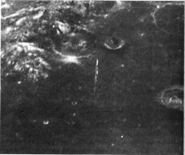 Рис. 4-28. Часть купола над кратером Пикар в Море Кризисов (крайний справа). В центре снимка «Шпиль в Море Кризисов». Обычного объяснения аномального коэффициента отражения, видимого на этом снимке, нет. Увеличение со снимка AS16-121-19438.