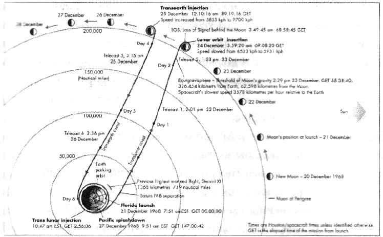 Рис. 5-9. Траектория перелета, посадки на Луну и успешного возвращения на Землю.