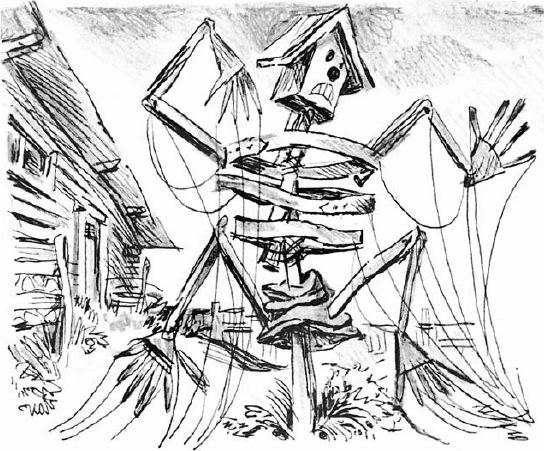 Он обтесал метровый деревянный брус. Проволокой примотал к нему несколько старых обручей от бочек. Получилась могучая, как у гориллы, грудная клетка. Из расплющенного ведра с пробитыми в нем дырами Форик смастерил «тазобедренную область», как у скелета в учебнике анатомии для старших классов (у Форика имелся такой на всякий случай). К этой железяке он прикрепил тощие ноги из реек. Ноги болтались и сгибались. У них были костлявые ступни из палочек. А к верхней части скелета Форик прикрепил такие же суставчатые руки. Их длинные деревянные пальцы зловеще постукивали друг о друга.