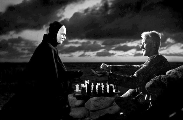 Кадр из фильма Ингмара Бергмана «Седьмая печать» (1957). Рыцарь играет в шахматы с ангелом смерти на фоне моря. Этому предшествовала картина: два коня на фоне моря