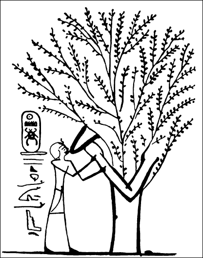 Древоподобное изображение Изиды с рукой и грудью и Тутмозиса III, настенная живопись. Фивы, гробница Тутмозиса III