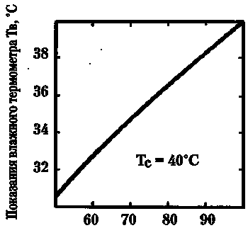 На рисунке 19 приведена широко известная в метеорологии так называемая психрометрическая кривая, рассчитанная для температуры воздуха 40 °C по сухому термометру. Видно, что чем ниже относительная влажность воздуха (измеряемая гигрометром), тем ниже показания влажного термометра, тем более прохладно чувствует себя человек при одной и той же температуре воздуха.