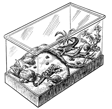Террариумы для каждого вида животных имеют свои особенности. Для амфибий устройство террариумов в принципе одинаково, за исключением некоторых деталей. Так, для разведения амфибий следует выбирать террариумы высотой около 50 см. Тритонов и лягушек лучше всего содержать в акватеррариумах либо в террариумах с водоемом; древесным лягушкам, квакшам и жабам подойдет террариум с небольшим бассейном глубиной около 3 см. В террариумах для рептилий должно быть высажено достаточное количество растений, желательно с крупными листьями. В среднем температура воздуха для амфибий должна составлять 22–24 °C, а для тропических видов – 23–26 °C. Так как для амфибий очень вреден перегрев, обогревательные приборы лучше всего располагать снизу и внимательно следить за уровнем температуры. Вентиляцию рекомендуется делать не слишком интенсивной.