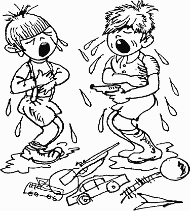 Глянули мы в окно: возле самой стены сухо, а чуть подальше — огромная лужа. Не кидать же портфели в лужу! Мы сняли ремни с брюк, связали их вместе и осторожно спустили на них портфели. В это время звонок зазвенел. Учитель вошёл. Пришлось сесть на место. Урок начался. Дождь за окном полил.