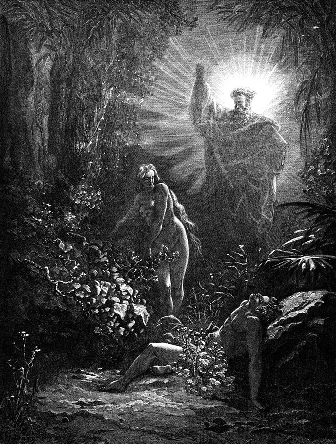 Не замедлили сказаться и следствия вкушения запрещенного плода: у них действительно открылись глаза, как обещал искуситель, и запретный плод дал им знание: но что же узнали они? – узнали то, что они наги. Возмущенное нравственное чувство открыло перед ними сознание их наготы, ставшей победным знаком чувственности и торжества плоти, и, чтобы прикрыть ее, они сшили себе смоковные листья и сделали из них опоясания – эту первичную форму одеяния. Но если согрешившие устыдились так даже собственного внутреннего голоса совести, то им совершенно страшно стало предстать теперь перед Богом. Настал вечер, и прохлада теней его разливала блаженство по саду. В это время обыкновенно происходило у них собеседование с Богом, которого они до сих пор с невинной радостью ожидали и встречали, как дети своего отца. Теперь же они желают, чтобы этого момента никогда не наступало. А между тем он приблизился, и они услышали знакомый голос. Ужас объял Адама и жену его, и они «скрылись от лица Господа Бога между деревьями рая».