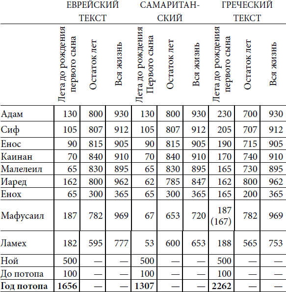 Над разрешением и соглашением этого различия в счете лет трудились многочисленные толкователи, но до сих пор дело не выяснено с достаточной полнотой. Делались всевозможные предположения. Одни объясняют эту разницу случайными ошибками переписчиков святых книг; другие в отступлениях самаританского текста видят последовательное стремление к уменьшению невероятной будто бы долговечности патриархов, а в отступлениях греческого текста от еврейского – стремление семидесяти толковников подвести библейское летосчисление под формы египетского; наконец, иные в уменьшенных показаниях еврейского текста видят преднамеренное искажение текста иудеями, желавшими этим доказать, что еще «не пришло исполнение времен», которое по древнему пророчеству должно было совершиться на шестой тысяче лет от сотворения мира. Больше вероятности имеют первое и последнее предположения, хотя, может, существовали и другие причины, еще не открытые наукой. Во всяком случае показания греческого перевода точнее, и они легли в основу летосчисления, принятого православной церковью и поддерживаемого многими знаменитыми учеными исследователями. По этому летосчислению рассмотренный период обнимает (до потопа) 2262 года.